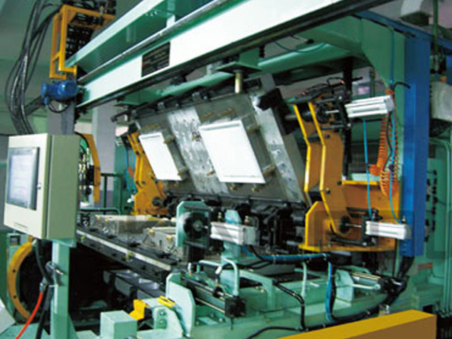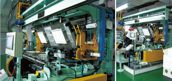 生產(chǎn)線為10工位平等升降、循環(huán)傳動。模架開模前具有水平提升功能,避免模架旋轉(zhuǎn)開模時擠壓門體。該線體具有安全可靠、結(jié)構(gòu)緊湊、占地面積小、效率高、適用多品種柔性生產(chǎn)的特點。