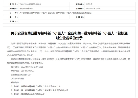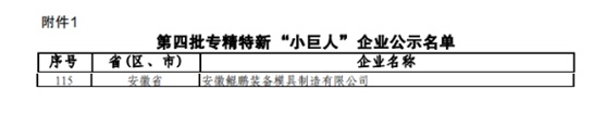 2022年8月8日,安徽省經濟和信息化廳公布的《第四批專精特新“小巨人”企業公示名單名單》,安徽鯤鵬裝備成功入選國家級專精特新“小巨人”企業。