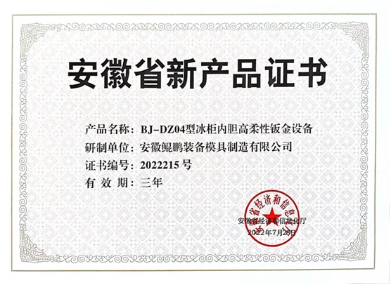 繼4月份的兩件省級新產品后,我公司的“3D仿形自動沖裁真空復合模具”、“冰柜內膽高柔性鈑金設備”于7月28日獲得了安徽省經濟和信息化廳頒發的安徽省新產品證書。公司目前累計獲得各級新產品認定共22項