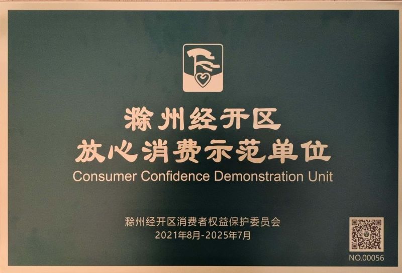 2021年9月29日公司被滁州經開區消費者權益保護委員會授予“滁州經開區放心消費示范企業”榮譽稱號。