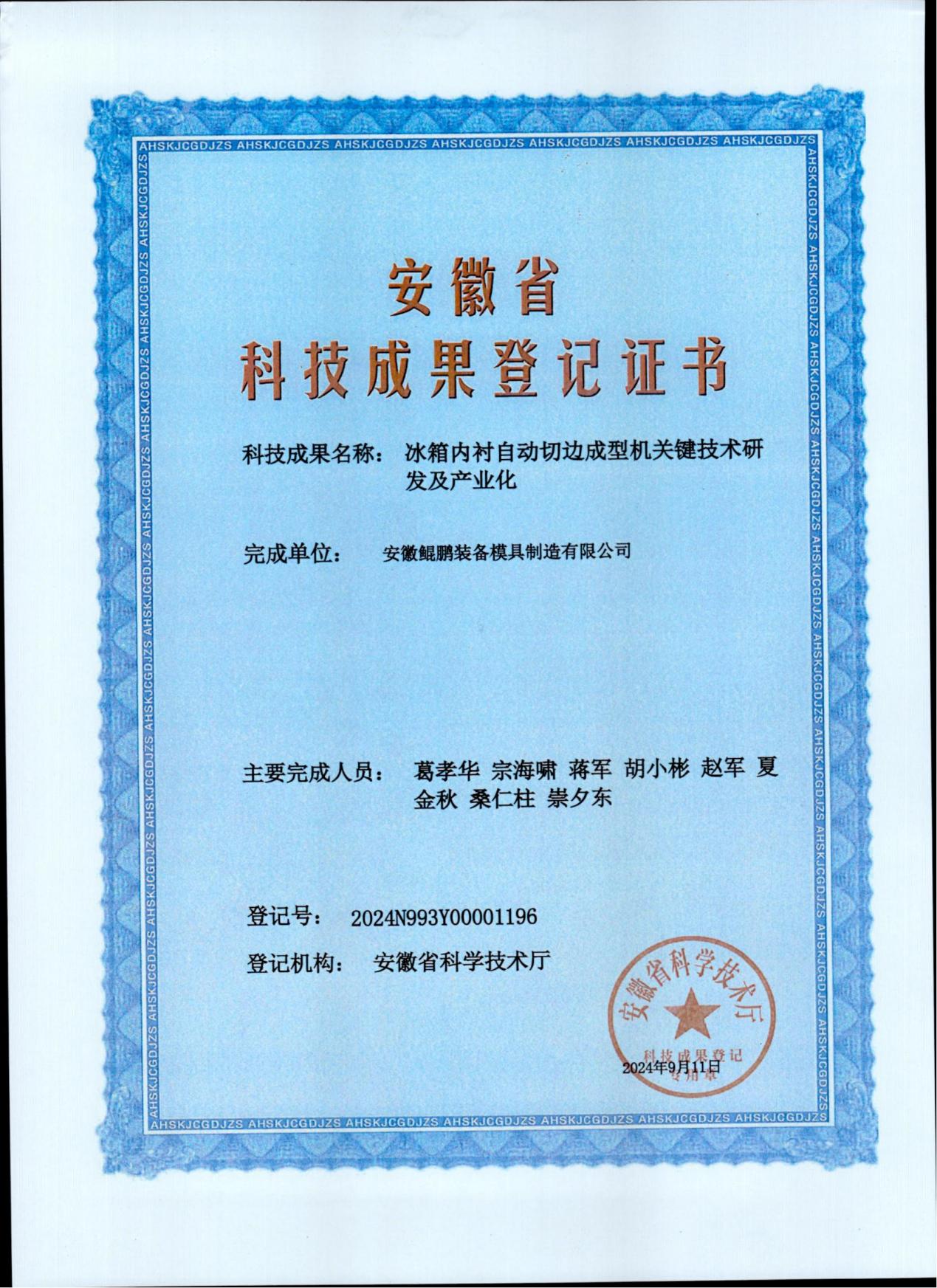 2024年9月,我司“冰箱內(nèi)襯自動切邊成型機(jī)關(guān)鍵技術(shù)研發(fā)及產(chǎn)業(yè)化”、“防盜門板成型設(shè)備關(guān)鍵技術(shù)研發(fā)及產(chǎn)業(yè)化”兩項科技成果通過安徽省科技廳認(rèn)定,獲得省級科技成果認(rèn)定證書。此外,“雙模旋轉(zhuǎn)汽車內(nèi)飾成型機(jī)關(guān)鍵技術(shù)研發(fā)及產(chǎn)業(yè)化”、多層塔式冰箱發(fā)泡設(shè)備關(guān)鍵技術(shù)研發(fā)及產(chǎn)業(yè)化”于今年2月份獲得省科技成果認(rèn)定,2024年我司共計4項成果通過安徽省科技成果認(rèn)定。